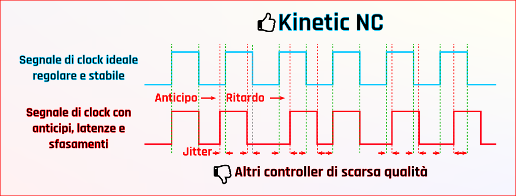 KinetiC-NC ricalcola sempre di volta in volta le rampe di frenata ed emette i segnali con una precisione indipendente dalla frequenza. Il rapporto di clock è sempre del 50%. I cambi di direzione vengono sempre eseguiti con precisione. Ciò significa che non c'è latenza e sfasamento, gli impulsi di clock non possono essere "omessi", in tal modo i motori passo-passo funzionano in modo fluido e possono esprimere una coppia maggiore, ulteriore fattore che ad esempio limita la probabilità del caso di perdita di passi dovuto a fatica durante la lavorazione.